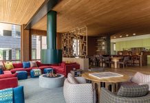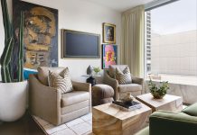 With restored pylons and foundation supports, a big party deck out the back was a natural addition. It’s the perfect place to start the day with breakfast and end it watching the sunset and all the points in between. Closed, the barn door sliders can cover the glass sliding doors to block the sun or provide extra insulation, but decoratively they set the scene with whimsy and pick up the red accents.Â