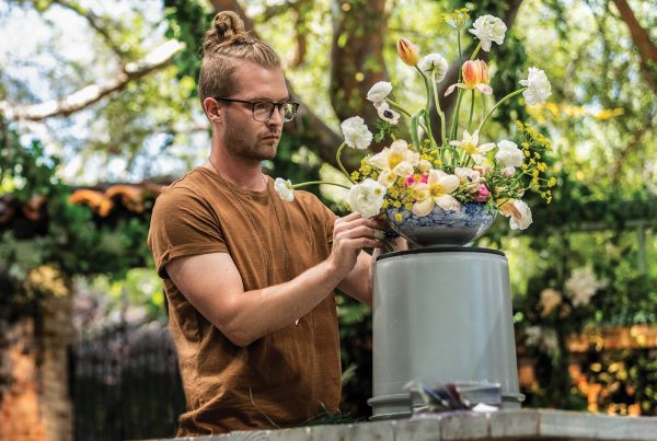 Honey’s sunny color and buzzy origin inspired floral designer Jamie Heusser when she created this winsome spring flower arrangement. “I began with beehive ginger to mimic beehives staked together with flowers growing around them,” the designer says. Taking her lead from the ginger’s warm, sunset tones, she added a mix of complementary blooms including lisianthus, dahlias, garden roses, ranunculus, small carnations and lavender. The individual varieties are clustered as if in a flourishing garden where they spread into others with their mix of arched and upright stems. “I consider how gardens grow when I design,” Heusser explains. To that end, the arrangement is naturally off center, with dimensional highs and lows that draw the eye in and out of the loose composition. For a charming finish, the designer added small Mokara orchids to imitate yellow butterflies fluttering around the ginger bracts.