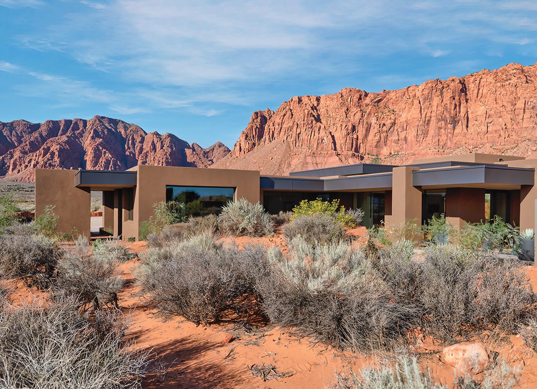 The community of Kayenta in nearby Ivins turned out to be their sweet spot; more precisely, a one-acre desert property surrounded by stunning scenery. “The magical cliffs, the soaring red rocks and mountains in the distance offer 360-degree beauty,” the owner explains. Matt Marten agrees. “There’s no place like it,” says the principal designer of Gulch Design Group. He and his father Terry Marten—who developed Kayenta—are the visionaries behind and ardent advocates of the community’s allure. Homes live lightly on the land with low profiles, preserved open desert landscapes and architecture that melds into the terrain, allowing its natural beauty to prevail. “It feels remote and we love the modern desert architecture that is so at home here,” says the husband, who, along with his wife, enlisted Marten to create the home’s architecture, Gregg Hodson to design the interiors and Paul Zabriskie to build the dwelling.