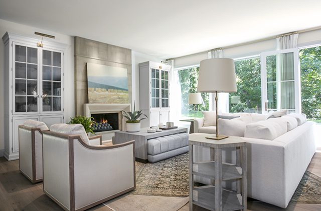 Before, the dark-painted living room featured stately moldings and a classic-symmetry-defined fireplace. Now, Barton has fronted the fireplace’s white oak back wall with a handsome limestone mantle in the renewed living room. “The materials are all about texture and tradition,” she says.