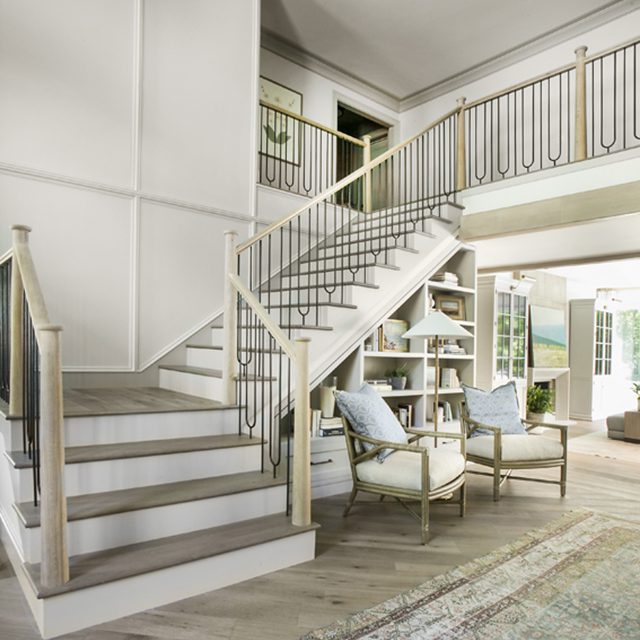 A grand “Gone-with-the-Wind” staircase with ornate railings once anchored the original entry. The new entryway shines with a squared-off staircase featuring customized iron balusters, and a charming reading area occupies a nook beneath it. White oak floors warm the entry space, and their chevron pattern add movement while fostering a relaxed ambiance.