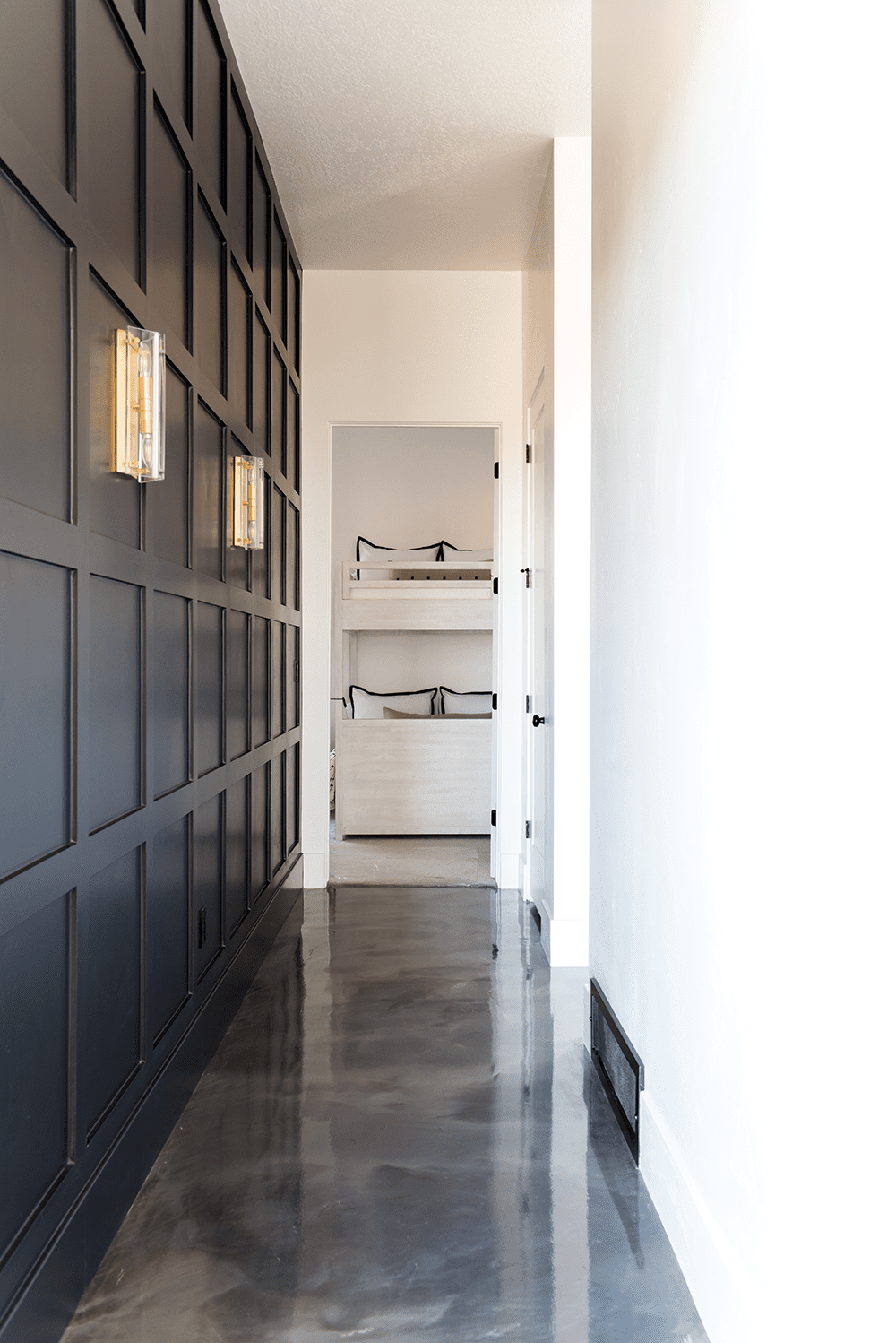 Applied molding energizes a black wall, creating dimension and exaggerating the wall’s scale. “The molding expands the wall visually, making it look taller and wider,” Kransen says. What’s more, the molding creates shadows that are accentuated by sconces.