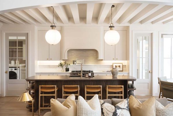The designer didn’t rely completely on color to transform the décor and update its traditional style. New furniture with soft silhouettes and curved, modern forms also unify the spaces while making them look and feel current. “Dichotomy was always our plan,” says Holmberg, who masterfully contrasted modern and vintage furnishings with the home’s classic architectural features including arches, moldings, doors and hardwood floors. “There’s a playful charm to the pairing of bulbous furniture and antiques that are still in conversation with the house,” she explains.