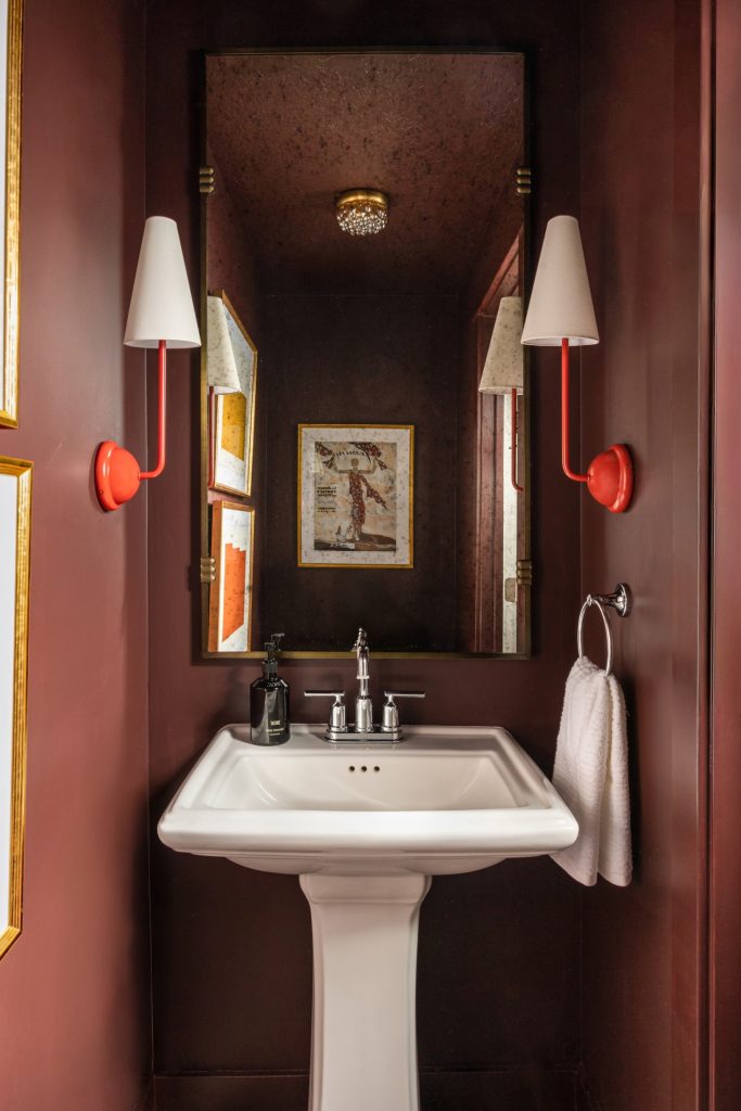 “We love using colored light fixtures as bold, jewelry-like accents, especially in a moody, monochromatic space. It’s an easy way to bring energy and make even the smallest room feel intentional and well-designed.” —MADISON STEWART, SENIOR DESIGNER AT ALICE LANE INTERIOR DESIGN