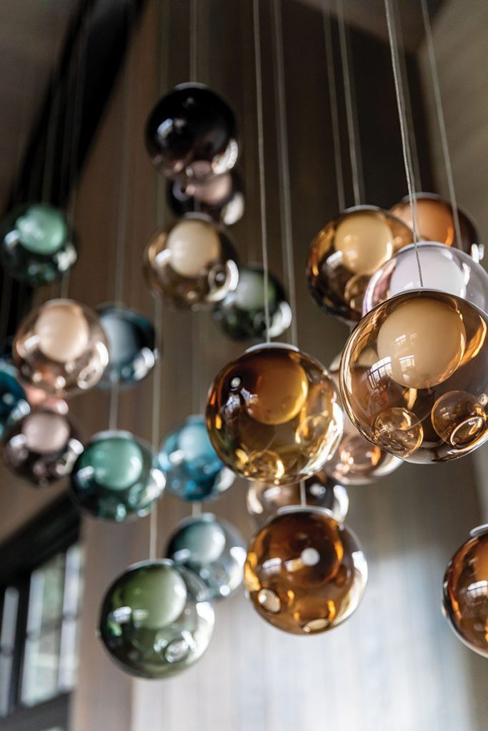 Throughout, lighting becomes a kind of narrative device—bridging the couple’s former city life with their new mountain rhythm. From the Bocci chandelier cascading over the stairwell to the Gabriel Scott fixture in the family room and the Articolo sconces in the primary bath, each piece was chosen as much for its sculptural beauty as its ambient glow. Delaney explains, “The lighting is a way to bridge the couple’s urban life with their new mountain one.”