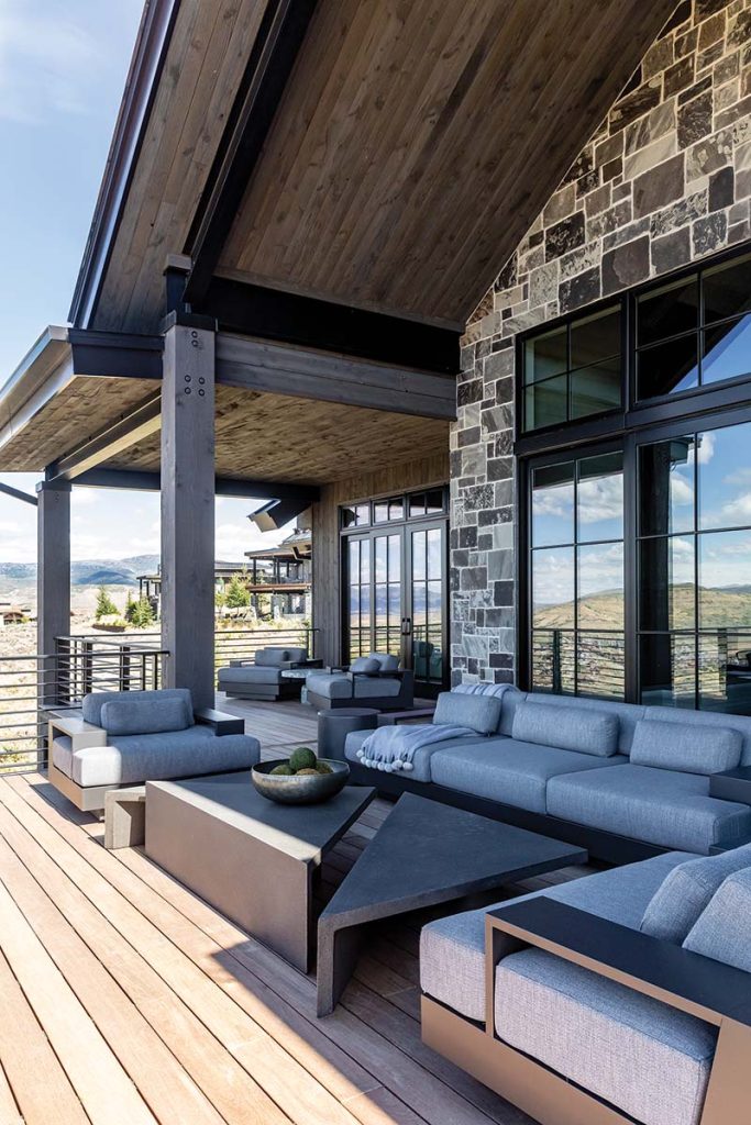 Their new home at Victory Ranch in Heber, just minutes from Deer Valley and Park City, captures that balance perfectly. Architect Tim Furner of Highland Group grounded the residence in its alpine setting with quarried gray stone, blackened steel accents and tongue-and-groove wood ceilings that extend from the entry through the main living spaces. Inside, designer Carrie Delaney translated the couple’s urban sophistication into a mountain setting—refined, tactile and deeply comfortable. “We wanted it to feel at home in the mountains yet still reflect the polish of their city life,” she says.