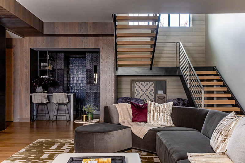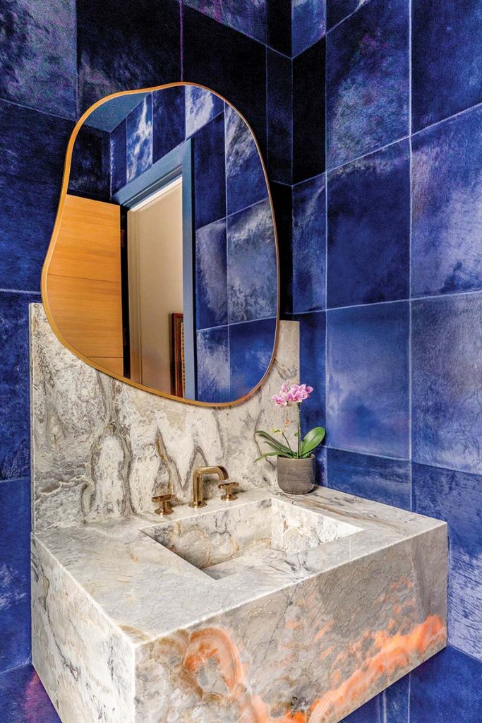 Downstairs, the lower-level family room redefines the idea of a “cozy retreat.” Clad in dark tongue-and-groove oak with suede damask wallcovering and midnight-blue glass tile, it’s equal parts lounge and lounge act. “This is a more elevated family room, equally suited for an evening cocktail party as for a family hangout,” Delaney says. A Verellen sectional, leather coffee table and champagne-toned rug from Regency Royale complement the sleek marble-topped bar, where the same Palissandro Bluette stone used in the great room’s hearth reappears in a dramatic waterfall edge. Overhead, a Gabriel Scott chandelier glows softly—another nod to the home’s sculptural approach to lighting.