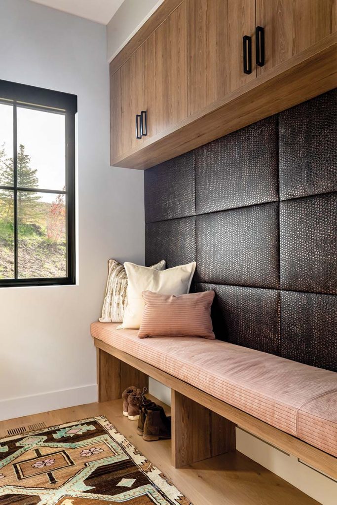 Even the mudroom feels considered and chic. “We wanted something functional yet cool and different,” gushes Delaney, who imagined the space’s leather-paneled bench back that subtly shimmers above a stitched nubuck seat—proof that practicality can still feel indulgent.