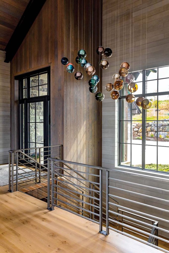 The adjoining great room carries that dialogue forward. A Minotti sectional and custom nesting tables sit atop a wool rug from Regency Royale, its mixed pile heights adding dimension underfoot. The board-formed concrete walls and tongue-and-groove ceilings flow seamlessly down the stairwell, uniting the spaces visually and texturally. Above the adjacent stairwell, a custom Bocci chandelier—composed of hand-blown glass spheres in an ombré of cool blues to warm ambers—lights the space. “We specified every color and length so it followed the exact angle of the stairs,” Delaney explains.