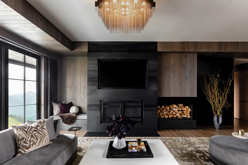Nearby, the dining room strikes an ideal balance between rustic and refined. A custom Brazilian table anchors the space, surrounded by gracefully curved Olivya Stone chairs and illuminated by a glittering Verga chandelier from Wired that brings evening sparkle to a backdrop of mountain views.