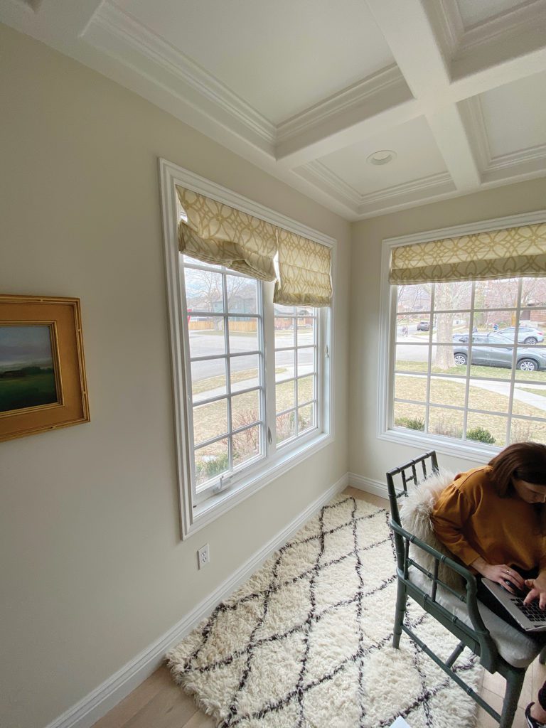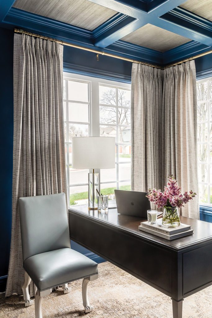 Upstairs, the designers wrapped the primary bedroom in soft beige grasscloth and painted existing wall panels to match, melding them into the décor. “We didn’t want a distracting accent wall,” Hall explains. “A bedroom should be a hushed moment.” Beautifully draped windows, luxe bedding and a rug layered upon plush carpeting help ensure that this space is exactly that. “It’s as nice as any hotel,” Smith says. “It’s so indulgent.”
