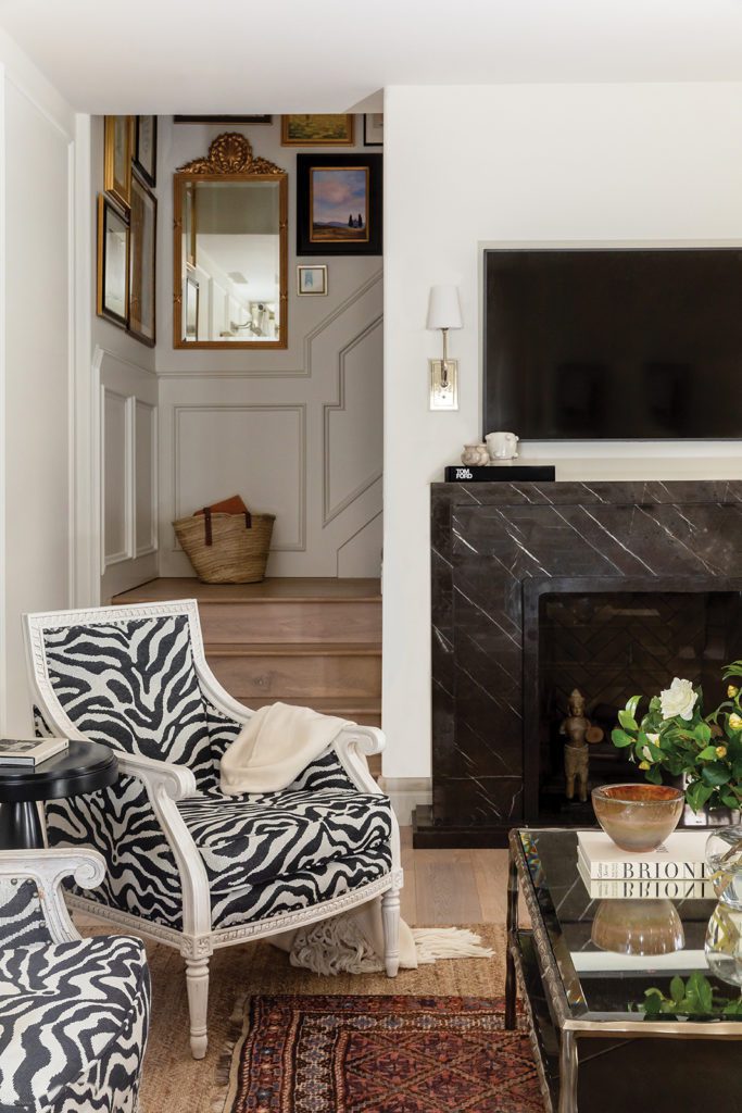 In the living room, the designers grounded a freshly furnished gathering space with an antique rug luxuriously layered upon a natural jute rug. A new sofa and eye-catching zebra-patterned accent chairs surround a surprisingly large coffee table. “Go big where you can in small rooms,” Hall suggests. “It makes them feel more gracious.” The TV hangs above a handsome fireplace reimagined with a black marble surround, creating a single focal point from the all-too-often competing elements. Sheer, floor-to-ceiling drapes visually raise the ceiling, and walls—painted a shade of warm white—enrich all of the home’s sophisticated living spaces. The small library, clad in brilliant teal, is a striking exception. “Enveloping a room in color makes it feel larger,” Hall explains.