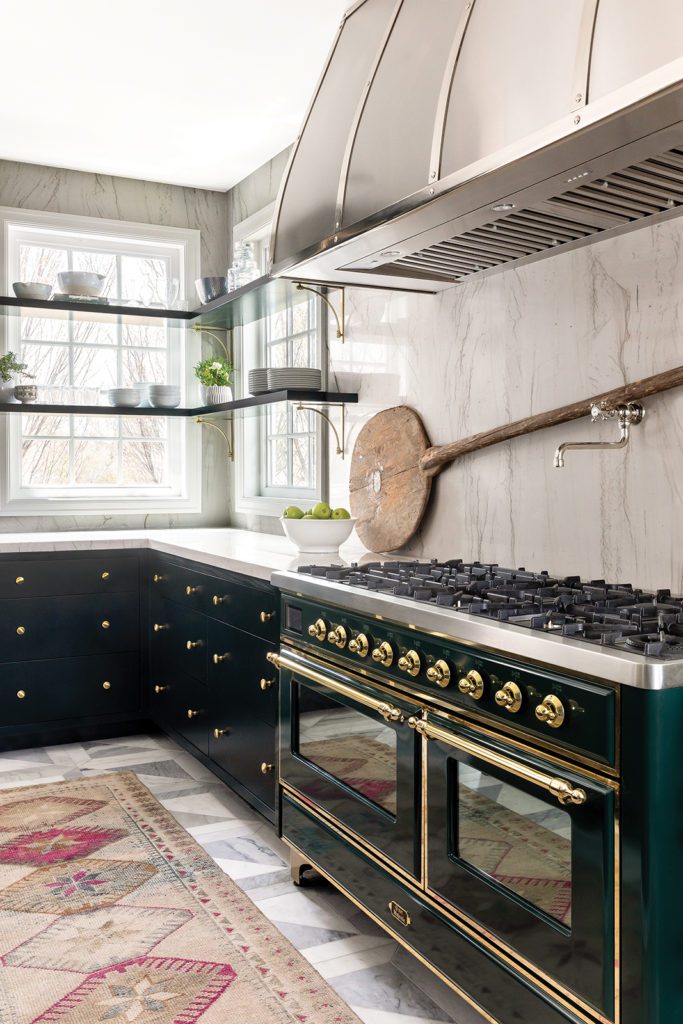 The creative team reconfigured the kitchen and eliminated the work area’s galley-like formation. “The new layout makes all the difference,” Smith says. “It’s so functional and now I have a lot more fun cooking.” With the layout in order, the designers focused on filling the room with natural light and fearless style. They framed the new range wall with corner windows fronted by open glass shelves. Upper cabinets are noticeably absent. “We like to have a wall without upper cabinets to widen a room,” Emmett says. A brass-knobbed Ilve range anchors the focal wall brilliantly. “It’s a big hero and deserves the moment it creates,” Hall explains. The dark green range inspired the sophisticated hue of similarly colored cabinetry fashioned with flat-fronts and brass inlays. “The blackened green color makes the room feel less like a kitchen and more like a gorgeous custom scene you’d expect out of a cool restaurant or bar,” Bennett explains. Agreeing, Hall adds, “We are in a design renaissance now. People are so exposed to everything, so we want to create things they haven’t seen.”