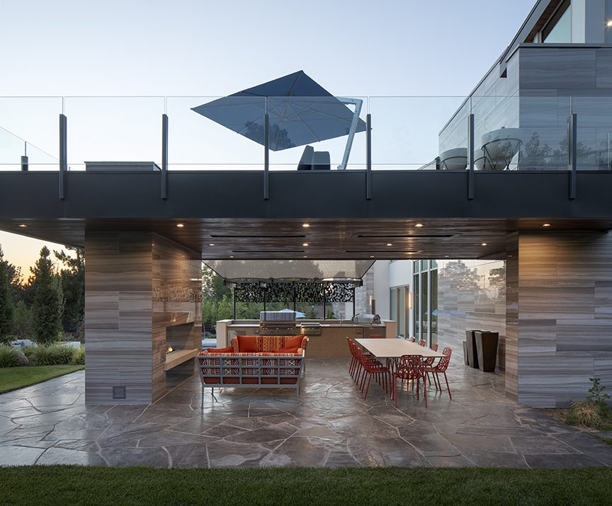A two-sided fireplace anchors the patio of an Olympus Cove home remodeled by designer/architect Ron Godwin. Not only does the fire feature warm two patios, but it also helps to support a large deck above. (Photos by Kyle Aiken)