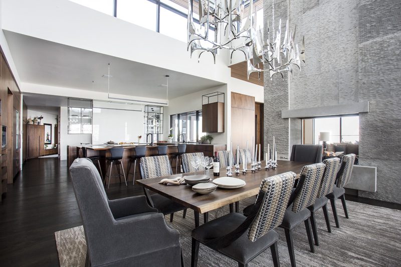 Flames dance on glass inside a fireplace opened on three sides to a chic Salt Lake City condominium designed by Karen Butera. The fireplace separates the living and dining areas while leaving spacious views open between the spaces.