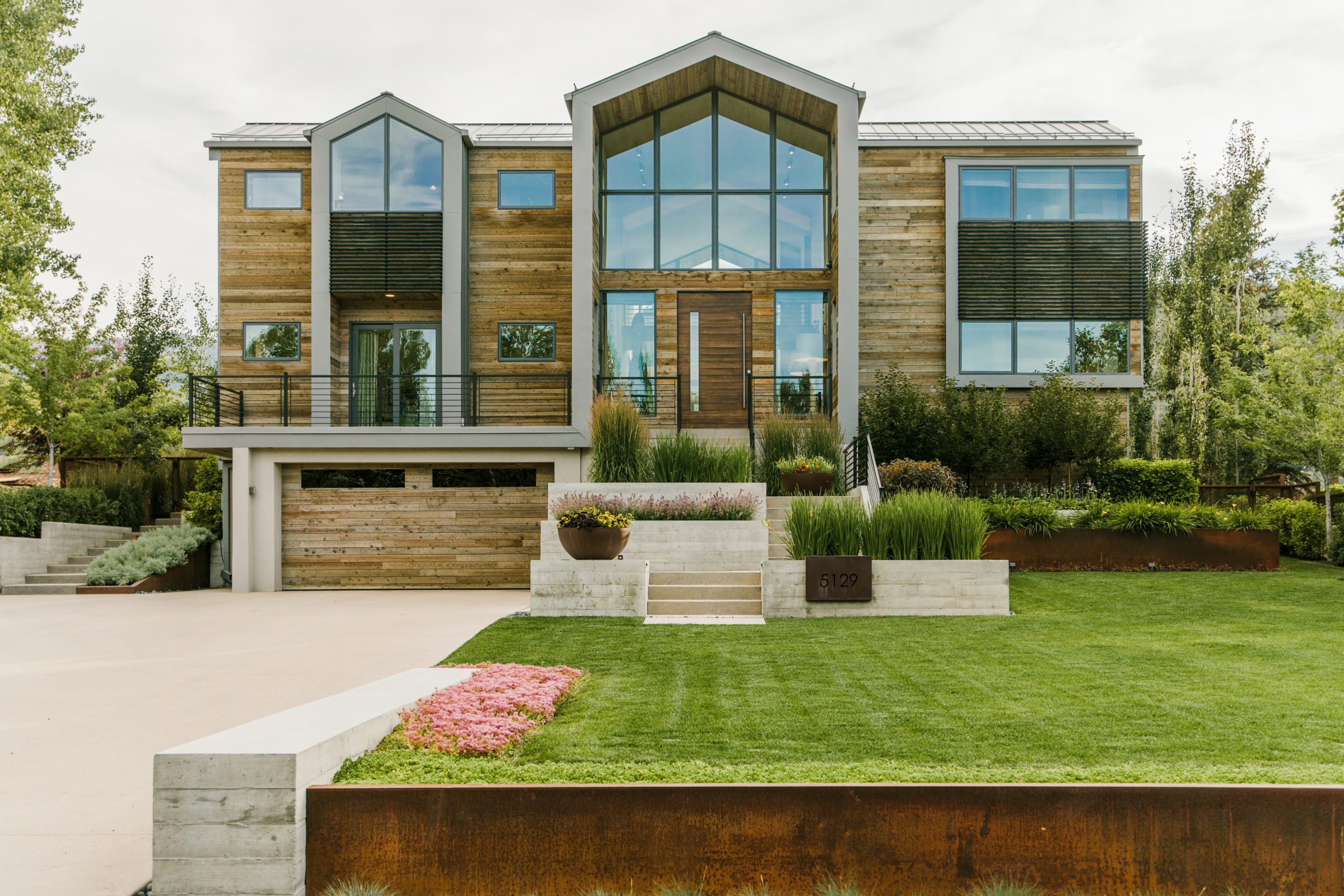 The 5,500-square-foot home features four bedrooms, five-and-a-half bathrooms and a custom indoor rock-climbing gym. Barn doors and walls fashioned from reclaimed barn wood nod to the historic ranch homes in the area, while multi-sliding glass doors and a dual-sided fireplace help expand the home’s volume and relationship to its environment.