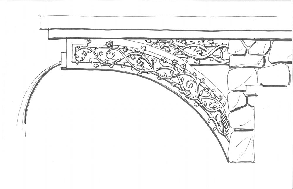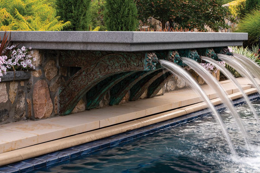 Fillmore and Talbot’s drawing of a corbel-style scupper illustrates an intricately patterned design. Artisans used the sketch to shape and detail a life-sized clay model used to develop molds that formed the finished bronze scuppers integrated into the pool’s water feature. A patinated finish lends an aged look and feel to the water-spouting sculptures. A submerged, built-in bench invites swimmers to sit below the spilling water and granite platform above.