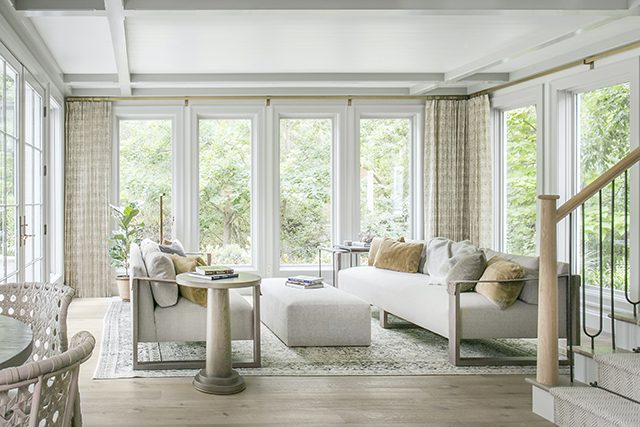 “We gave the owners back their backyard,” says Talbot, who placed a secluded patio near the river at the bottom corner of the renewed property. A curved stacked-stone wall features a built-in bench that wraps around one side of the raised firepit. Beneath the nearby deck, the designer created a children’s play area replete with a sandbox and spigot. “It feels like a second backyard down here,” he says. Photography by Josh Caldwell.