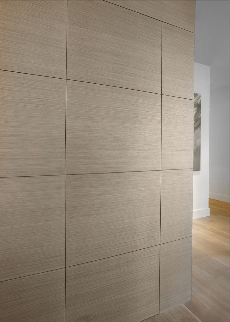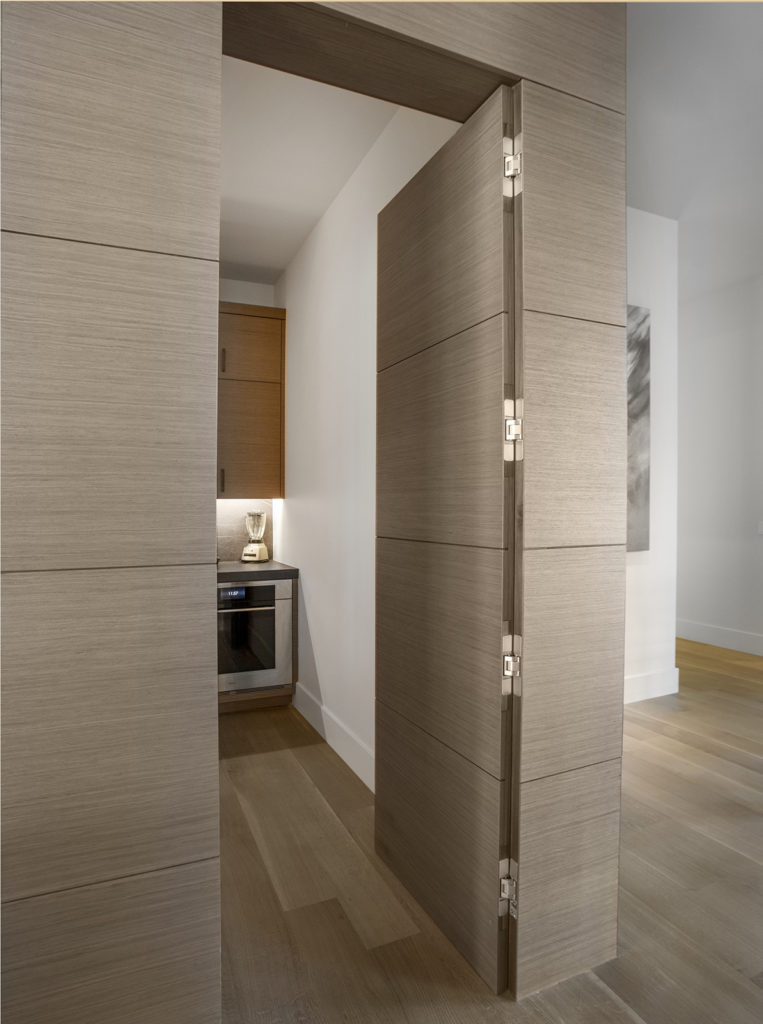 Very subtle opaque glass doors open to the pantry in this sleek Promontory home designed by K. Rocke Design (Kristen Rocke).