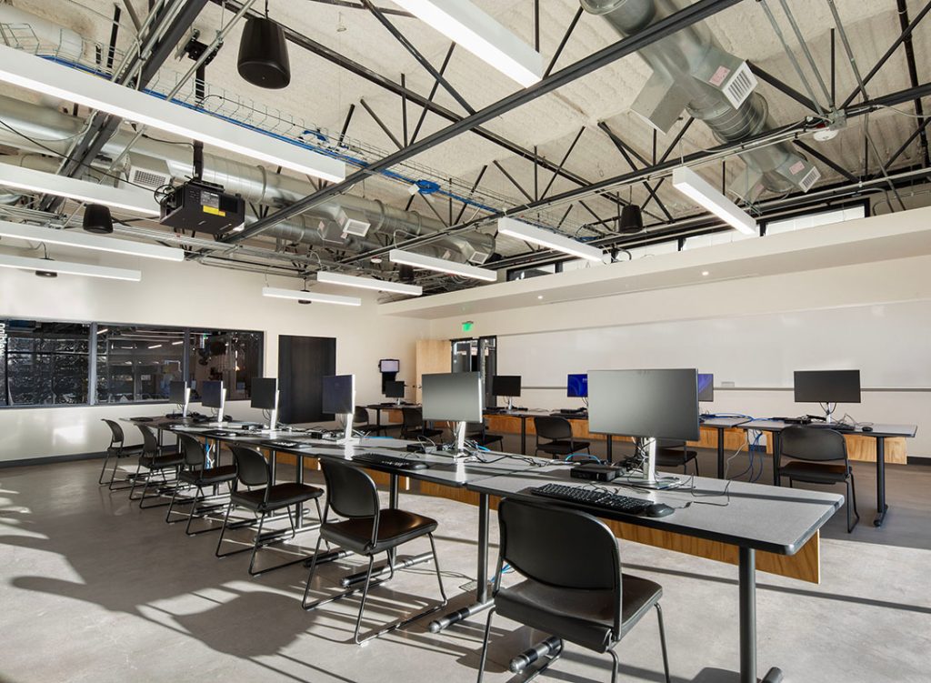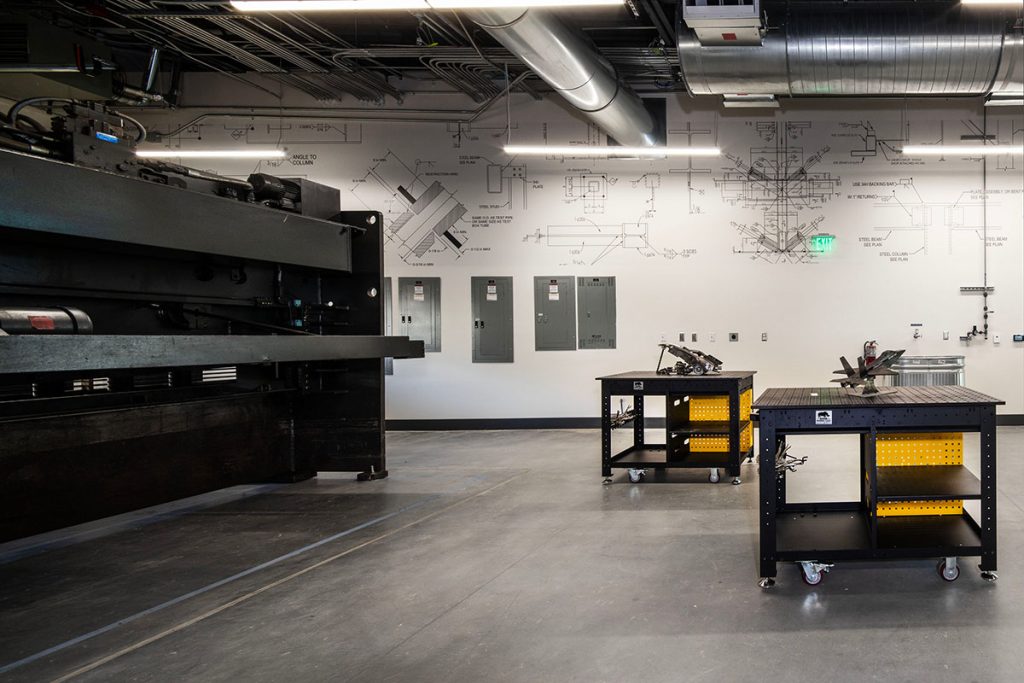 The classroom is equipped with computers has windows looking out to the welding and fabrication areas.