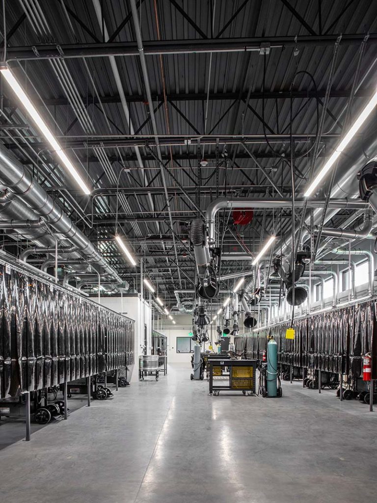 This central work area reaches to the rear of the building. On each side, there are welding bays. In all, there are 70 welding bays and 10 fabrication stations.