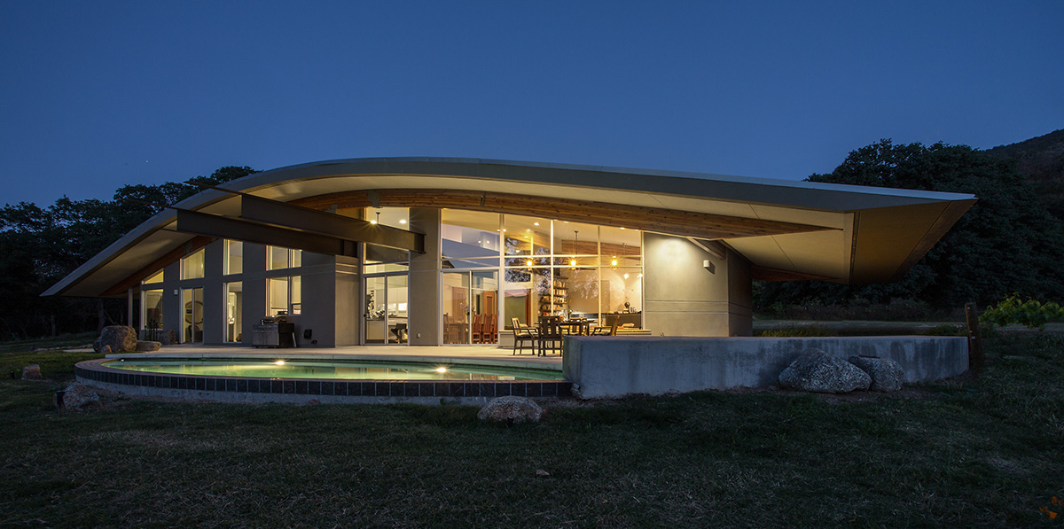Together with their architect, Arthur Dyson, FAIA, they selected a building site outside the 100-year flood plain, and on the highest point available. The river flows from Kings Canyon National Park and a few miles upstream from the home, Pine Flat dam stabilizes flows. The modest one-bedroom home is a single level, but the large open living space soars up with a high ceiling designed for accommodating audiences and acoustics for musical performances. Dyson’s roof design slopes down to connect it to the ground and minimizes the home’s height on the highest point on the parcel. The roof design also works with the solar orientation and eliminating glare, as well as directing rain run-off away, while still providing for views to the river coursing below. The home and its grounds frequently host gatherings, and it is a favorite fund-raising spot for Friends of the Kings River.