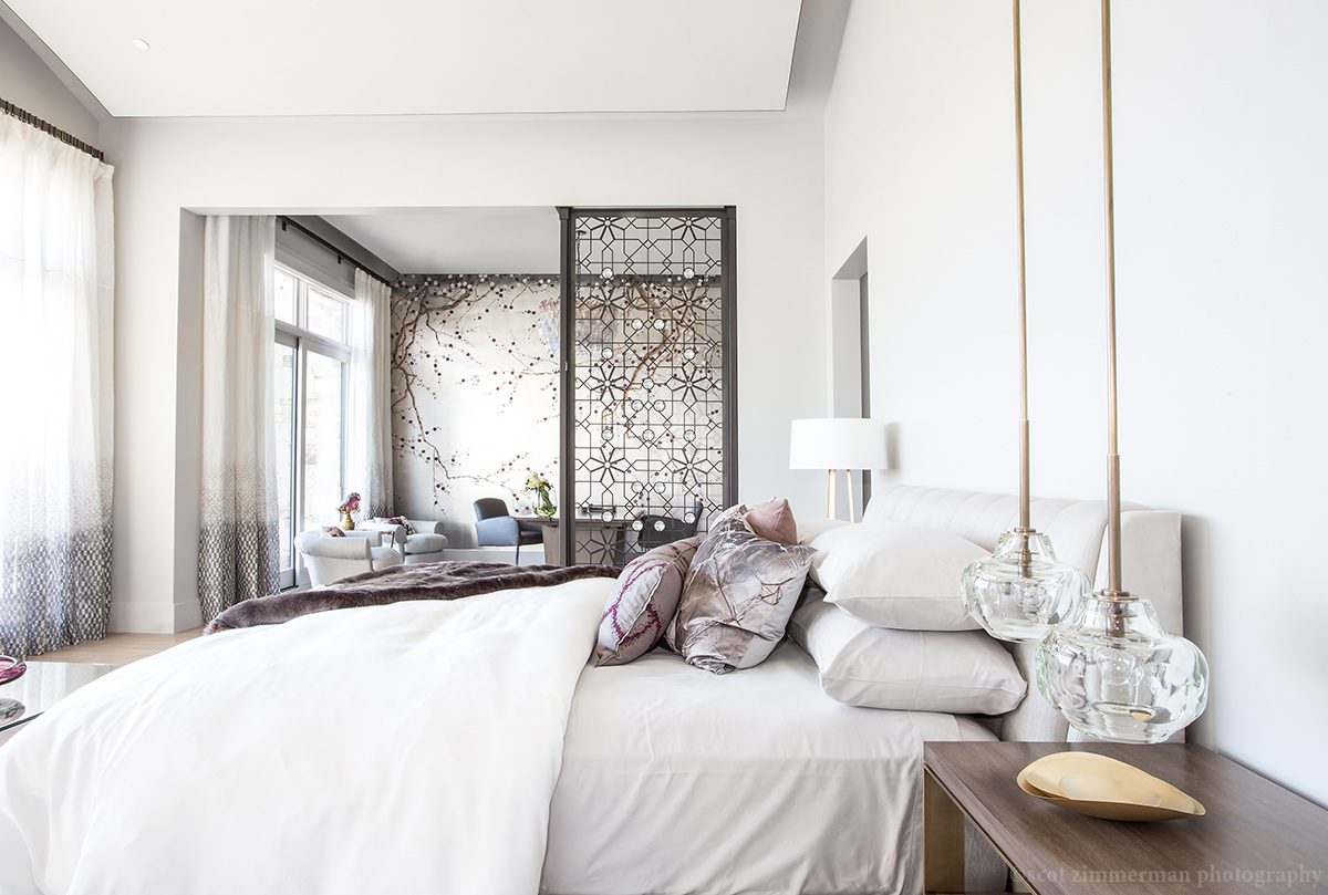 The bedroom featured above is in a quiet corner of the main floor of a Glenwild home (Upwall Design, architect; Dubell Construction, builder). AMB Design (Anne-Marie Barton) finished it in white with accents in patterns and neutrals.