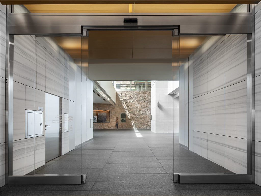 Security begins at the portals between the lobby corridor to the elevator banks. The corridor’s ceiling’s angled boards provide for recessed lighting and consistent illumination.
