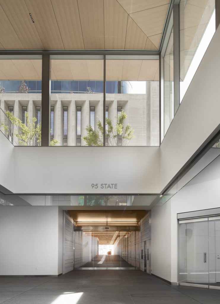 The lobby has conversation areas well-spaced to allow for privacy. The entrance on 100 South is street level, but as one walks the long corridor of the lobby, it becomes below the grade of hilly State Street.