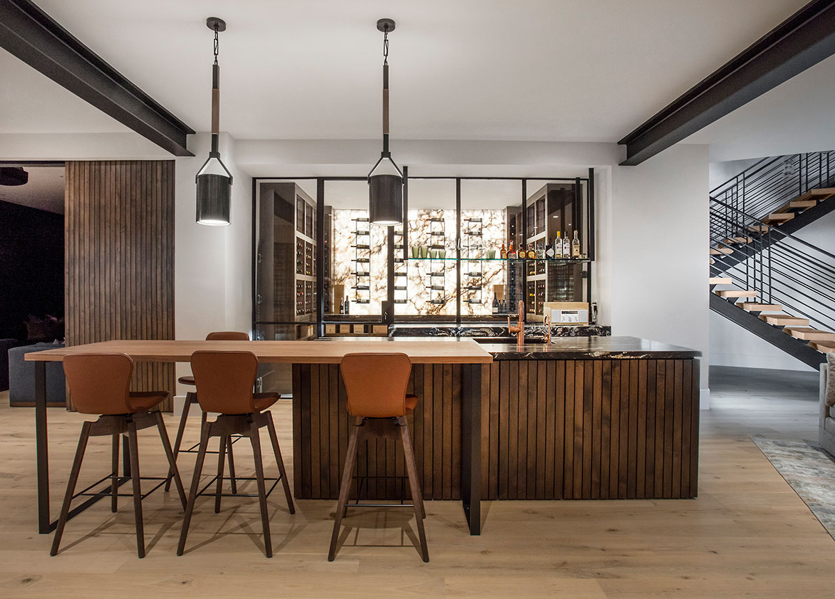 This lower-level bar maintains the clean lines and uncluttered look of the home’s modern mountain design. A game table finds a place beneath the stairway. Kristen Rocke, K Rocke Design is the interior designer.