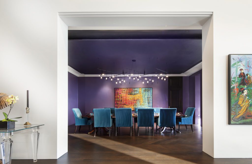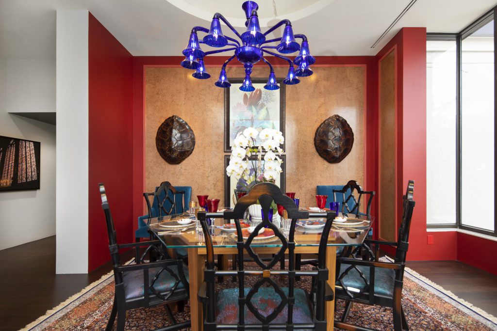 Big, bigger, biggest describes the dining options in the Salt Lake City Skaggs mansion (design by Cody Beale). The first informal and interesting room seats four to six for a meal set in unexpected combinations of bright harmonious color. The second table seats ten and promises a late evening meal of foods as fragrantly rich as the colors of the room and conversations ranging from lofty intellectual heights to deeply held secrets. The final table for 12 – 14 on a covered patio grandly overlooking the Salt Lake Valley and the peaks of the Wasatch is certain to inspire gratitude and a celebration of being alive in such a beautiful place.