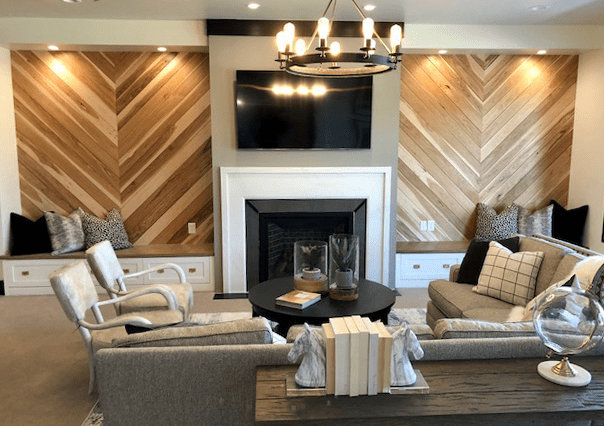 The talented team framed the lower level’s fireplace with walls clad in wood planks arranged in a head-turning chevron pattern. Built-in benches add to the feature’s savvy design.