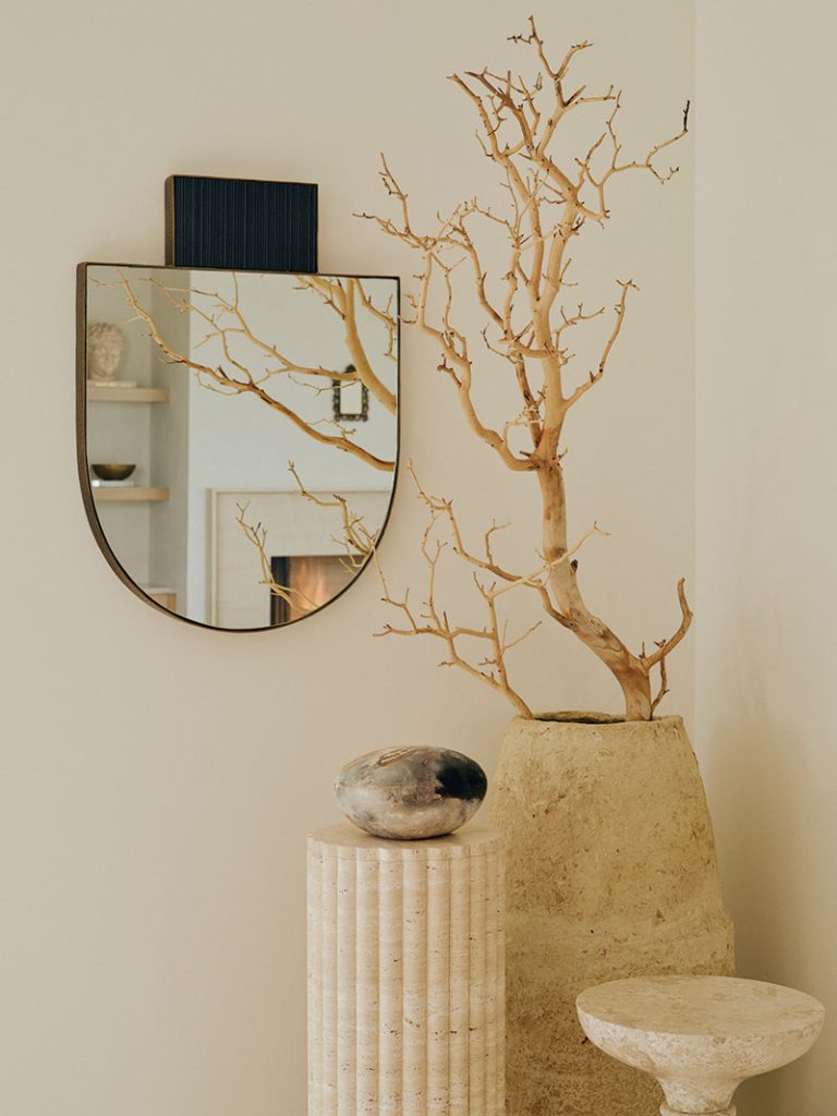 Throughout the home, shapely branches and other plants curated by Cactus & Tropicals lend a sense of freshly-foraged elegance to the design. Here, a large Manzanita bough stands like a sculpture among vintage pottery and Noir pedestals for a restful view. Mirror by Arteriors.