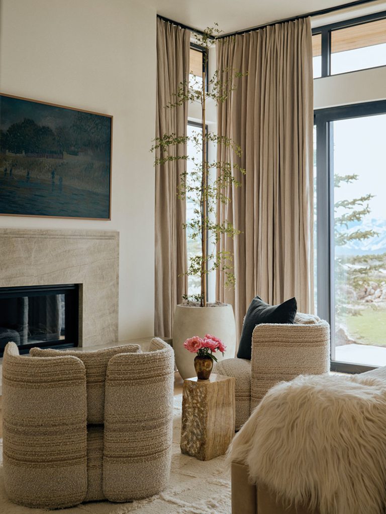 Staged in front of a custom ribbed cast-stone mantel, a chic collection of vintage seating and modern-edged pieces form an elegant sitting room on the home’s main level, showcasing the best of the interior’s warm palette. Sofas are by Lawson Fenning; coffee table by RH; lounge chairs and end table by First Dibs; table Lamp by Kelly Wearstler; standing lamp is from Crate and Barrel; sconces by Farrah Sit.