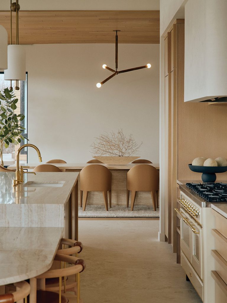 Plaster, natural stone and honey-hued white oak were the driving forces of materiality in the design. On the main level, the dining and living spaces are wrapped in white oak on both ceilings and floors. Between, a thoughtful blend of chic modern furnishings and carefully selected vintage finds infuse personality and visual interest from every viewpoint.