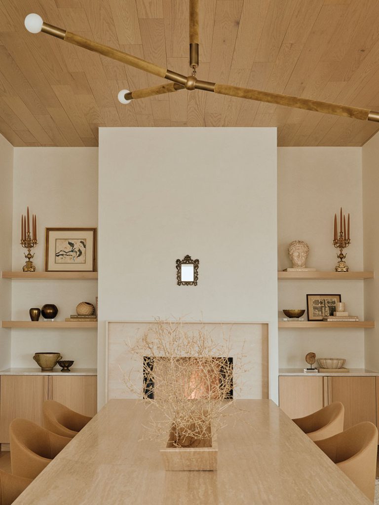 Texture drives the design interest in the elegant dining room. Travertine and wool meet brass, ceramic and even suede for a simple but striking mix of finishes to keep the eye moving through the space, before finally coming to rest on the expansive plaster-and-stone column of the fireplace, grounded by a vintage mirror in a surprising small scale. Dining table by Aprils Form; chairs are from RH; lighting is from Apparatus.