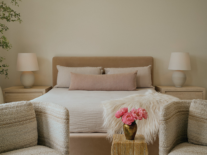 “There is a delicate push and pull between hard and soft materials,” says Taylor of the primary bedroom’s blend of furnishings. “There is also a quiet elegance to the tonal and textural mix.” Bed and nightstands are from RH; lamps are by Aerin Lauder for Visual Comfort.