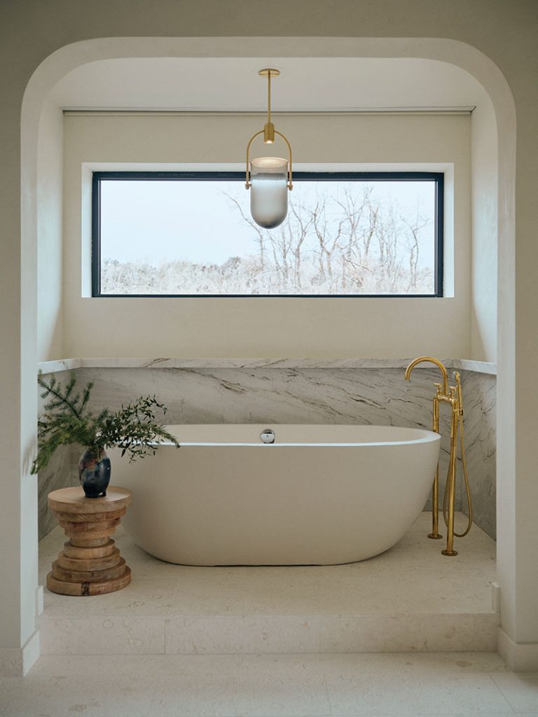In the primary suite, a floating bathtub is framed by subtly-patterned stone: a stone edge on the room’s rear wall delivers contrast and storage function, while underfoot brushed ivory marble tile provides a pared-back foundation. Stone sourced from Pinnacle; pendant is from Allied Maker
