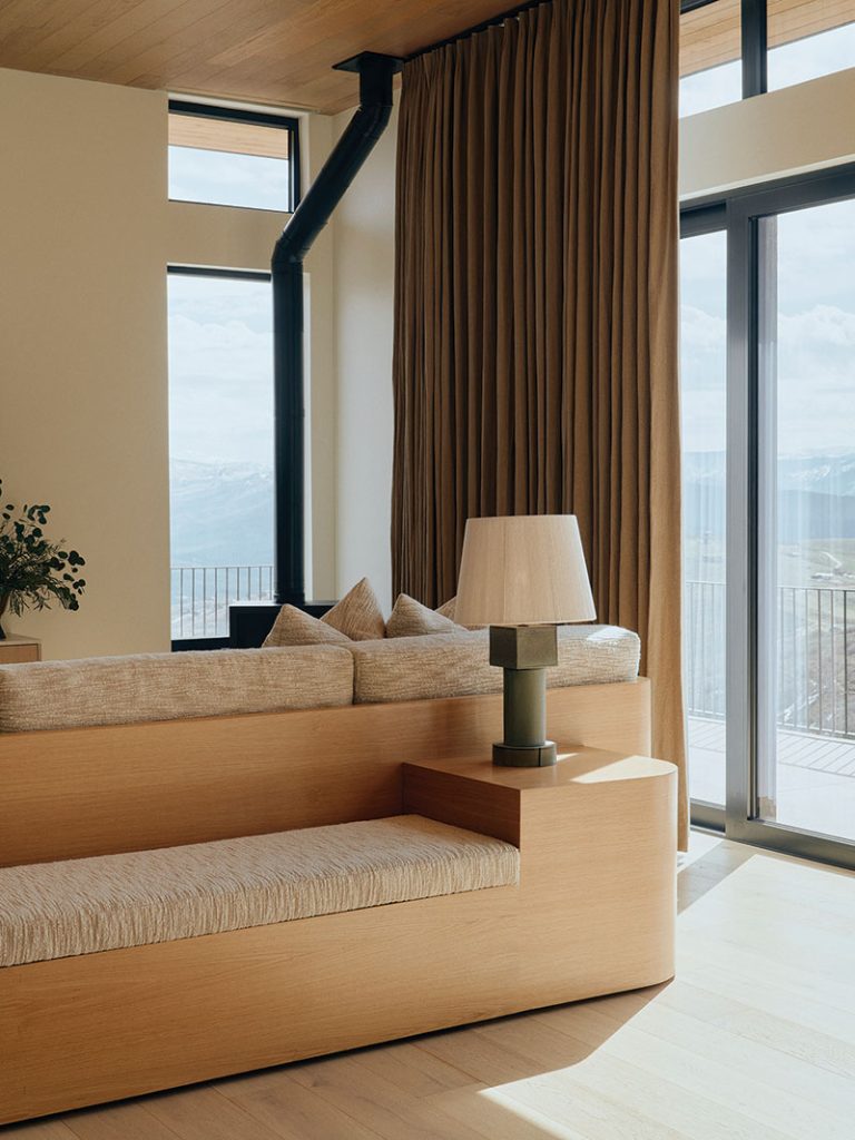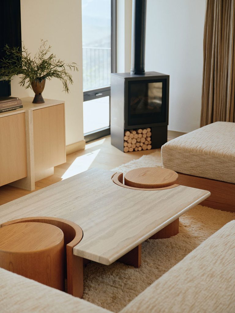 Similar curation can be spotted in the main living space, where plinth-like tables and a cast-stone ribbed fireplace lend strength and grounding to layers of plush furniture and decor. Down the hall, the comfort level hits a high note in an laid-back family room filled with sophisticated furnishings and finishes. A casual bar dressed up in high-contrast marble echoes nature-inspired hues present throughout the room. Nearby, a custom-built sofa wrapped in beige Verellen upholstery teams with a sculptural travertine midcentury coffee table by Lawson Fenning, a custom white oak console and a quaint wood-burning stove for a lounge space layered in luxury and personality, laden with color inspired by the mountain landscape just outside.