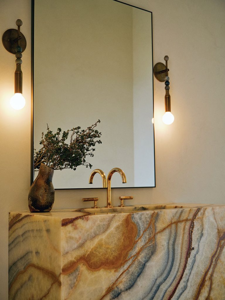 That balance of patina and polish was especially evident in the home’s bathrooms, where the integrity of natural materials sits at center stage. Striking stone, soft white oak, marble tile and unlacquered brass provide both organic presence and timeless longevity, working with gold-accented lighting to infuse a quiet soulfulness into each respective space.