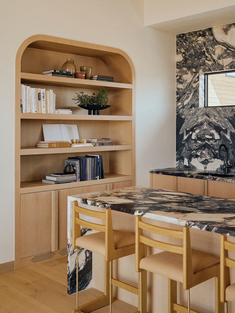 A lively high-contrast marble clads the bar in the family room, lending formality to the otherwise laid-back seating space.