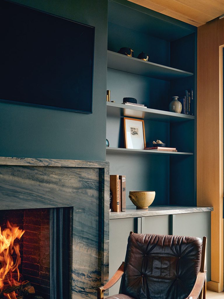In departure from the warm tones, a moody office features a deep green to mirror Park City’s pines, and rich gray-green stone on built-in countertops and the fireplace surround. Integrated-handle millwork and vintage seating maintain connection to the home’s overall design.