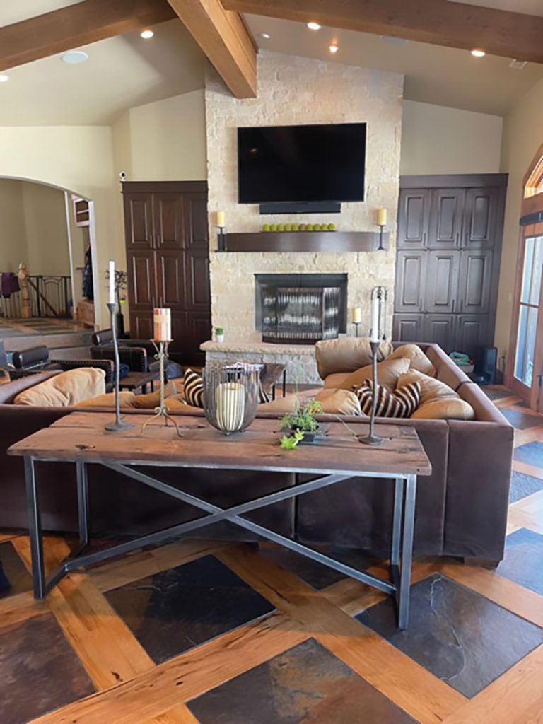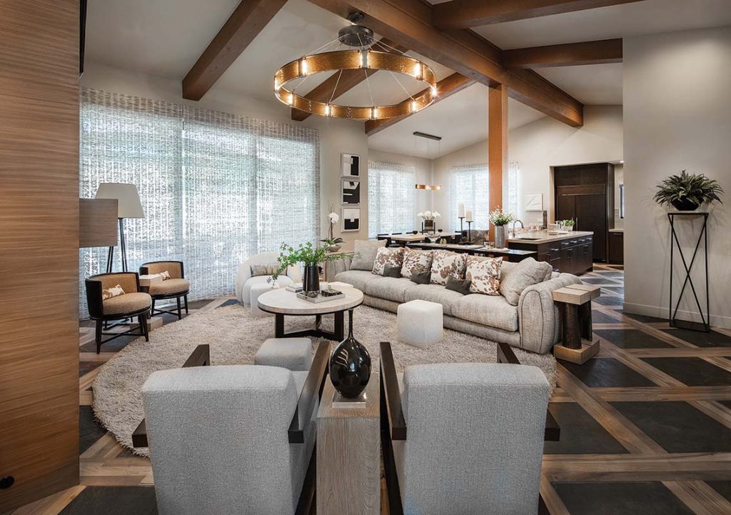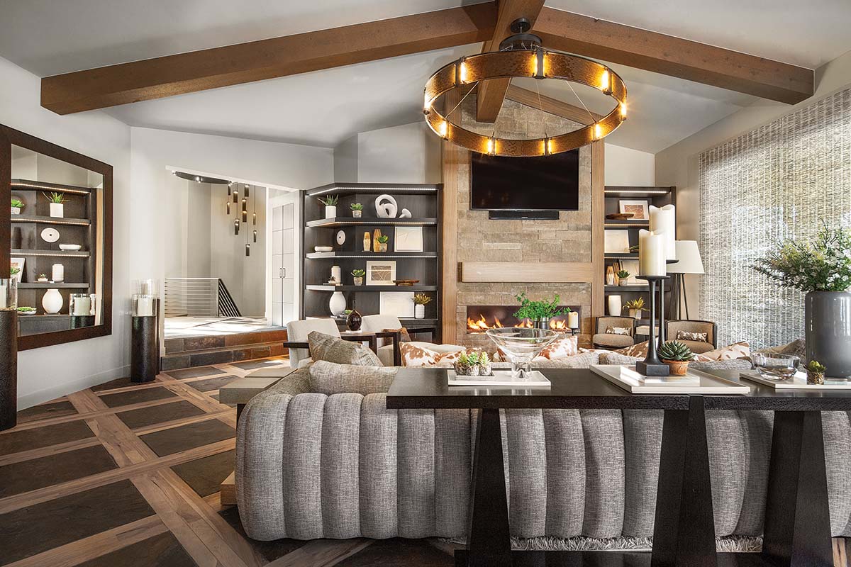 The designers employed neutral tones, rich textures and strategic wood elements in the living room to create warmth while complementing the multi-colored flooring. “The arrangement they had in the great room was very compact, and it didn’t take advantage of the scale of the room,” says Miller. “We brought in new furnishings with those matching wood elements, expanded the ceiling and employed custom lighting to utilize the entire space.”