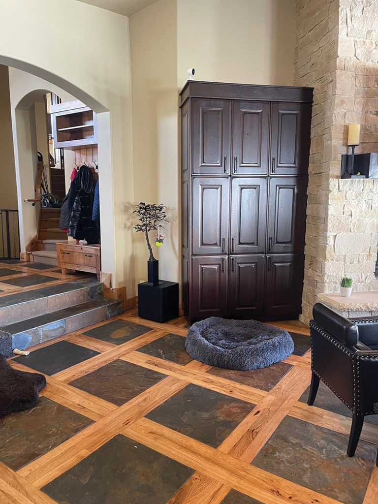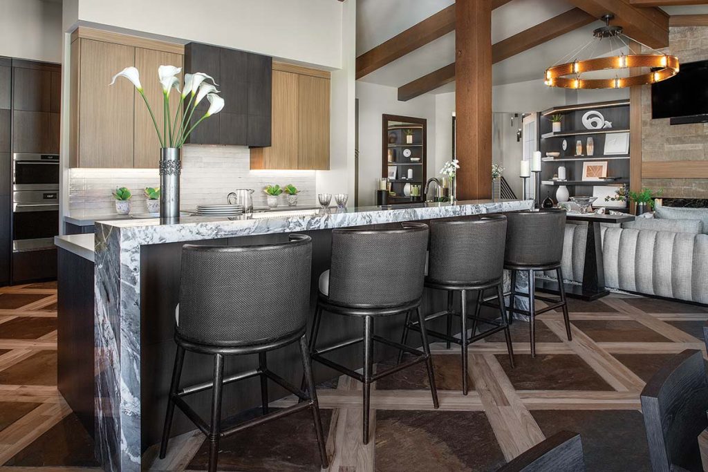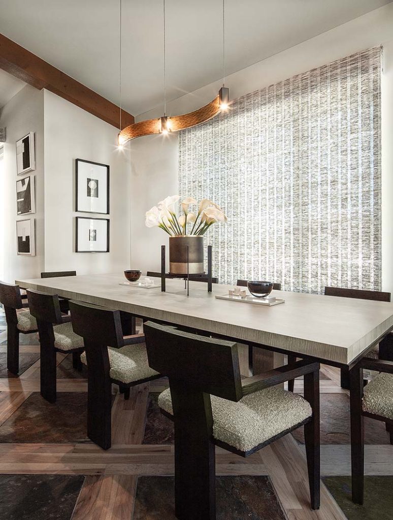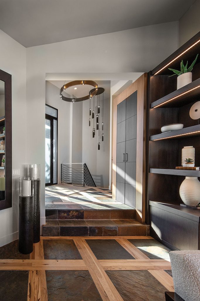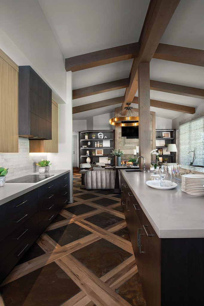 The first and most significant challenge was integrating the home’s existing, statement-making flooring into the redesign—a bold grid of slate and wood that spans the entry, great room and kitchen. After refreshing it with new stain, LMK celebrated this original flooring as the pattern-rich anchor for modern furnishing, updated fixtures and creative treatments that lighten the interior’s look and streamline the home’s primary public spaces.