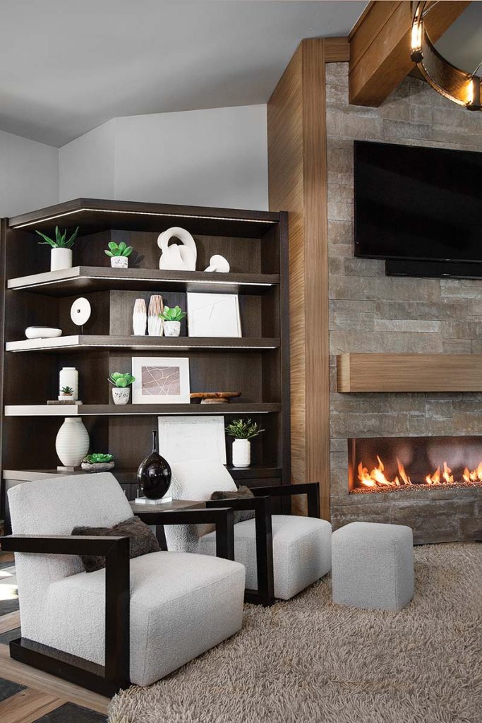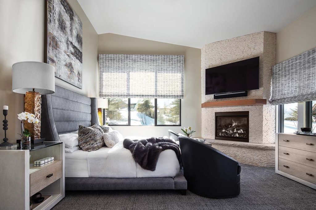 “Clean, calm, collected.” That’s how the designers describe the primary bedroom’s zen decor. A richly textured, neutral-toned travertine clads the fireplace, providing dimension and interest without overwhelming the space. Woven tapestry shades from Park City Blind & Design dress windows with natural texture and modern flair. Bed by Nathan Anthony. Dresser and nightstands from Century Furniture.