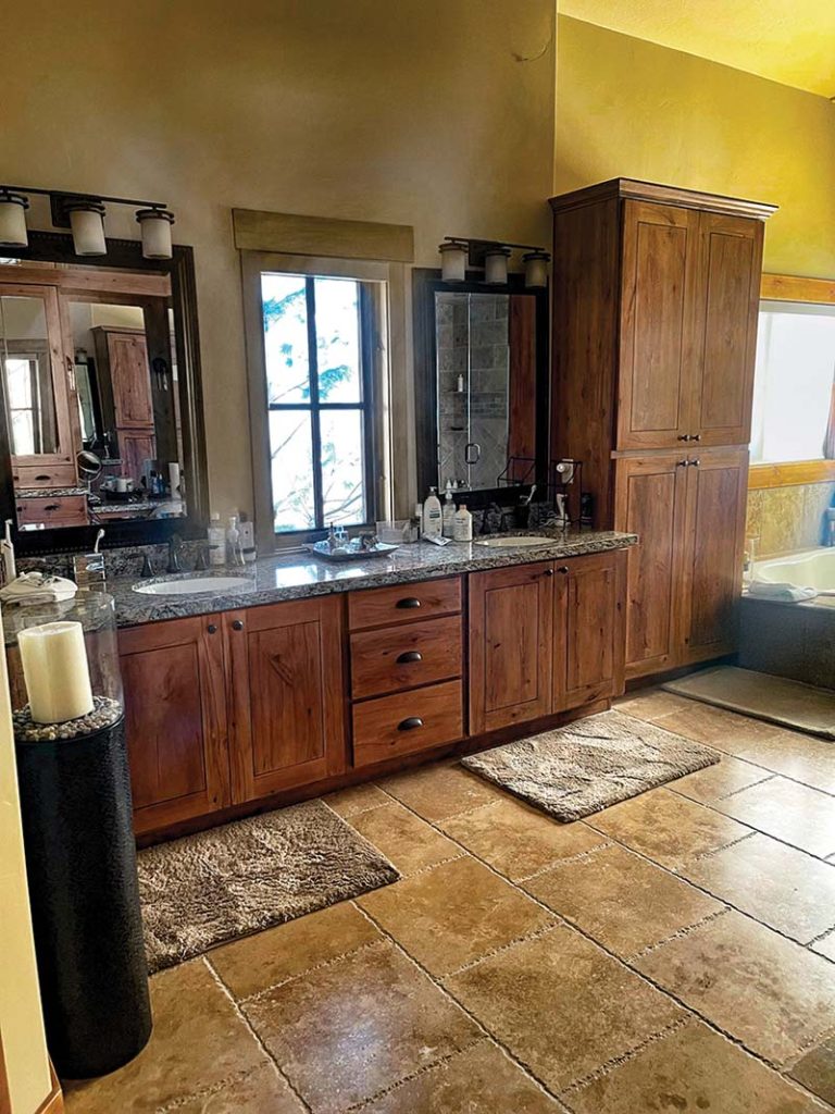 Two other major spaces were at the heart of this home’s overhaul: the kitchen and the primary bathroom. A key component of the open floor plan, the kitchen received a full facelift with simplicity driving the design. With its waterfall-edged quartzite bar seating and rich dark oak cabinetry, the sleek island centers the space, acting as a moody contrast to the elegantly lined quartz countertops and tile backsplash. Behind the range, an open pantry offers hidden storage and easy access to kitchen necessities. The new cabinetry throughout the great room echoes the straight lines from freshly squared-off doorways, delivering sophistication to the home’s rugged location.