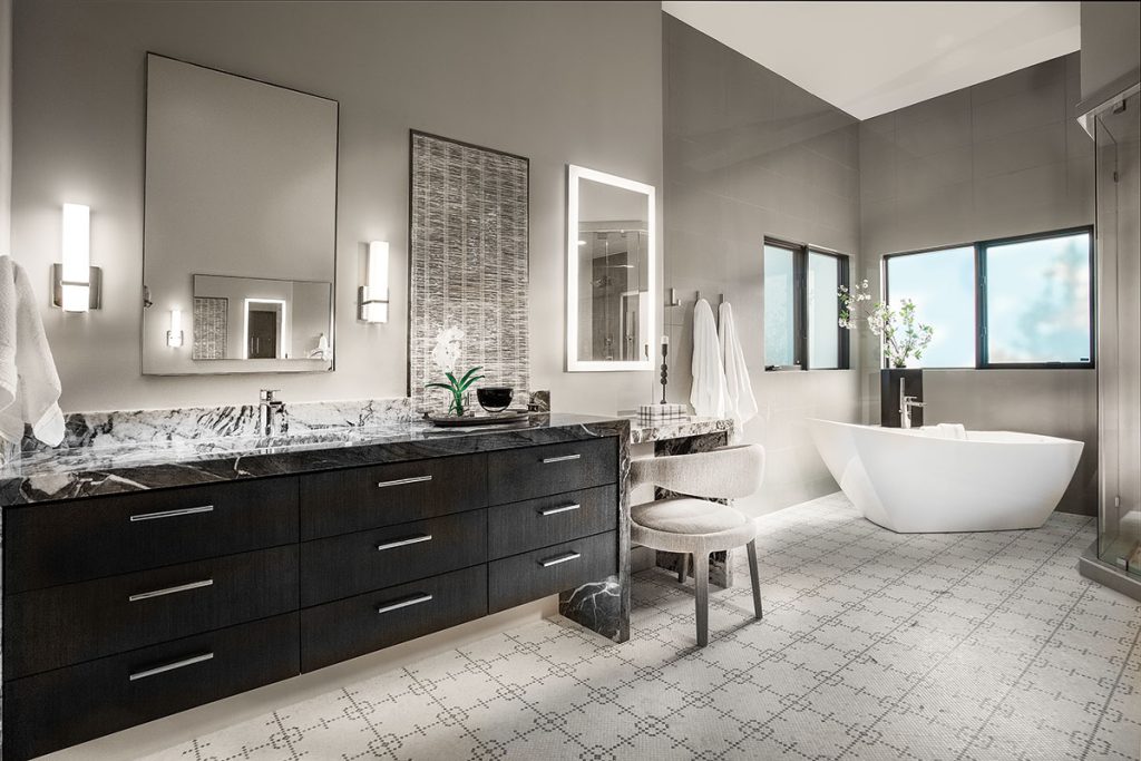 Naturally, the primary suite acts as a sanctuary for the homeowners; an interlude within the symphony of the design. Locke and Miller stripped the primary bathroom to the studs, building from the ground up to maximize space and continuity with the rest of the home. Minimal cabinetry is encapsulated in stone to match the kitchen’s waterfall island, while the linear pattern of the tile floor subtly repeats the checkerboard pattern from the great room and entry. A fresh configuration in the shower alcove celebrates mountain views and provides ample room for a sculptural standing tub.