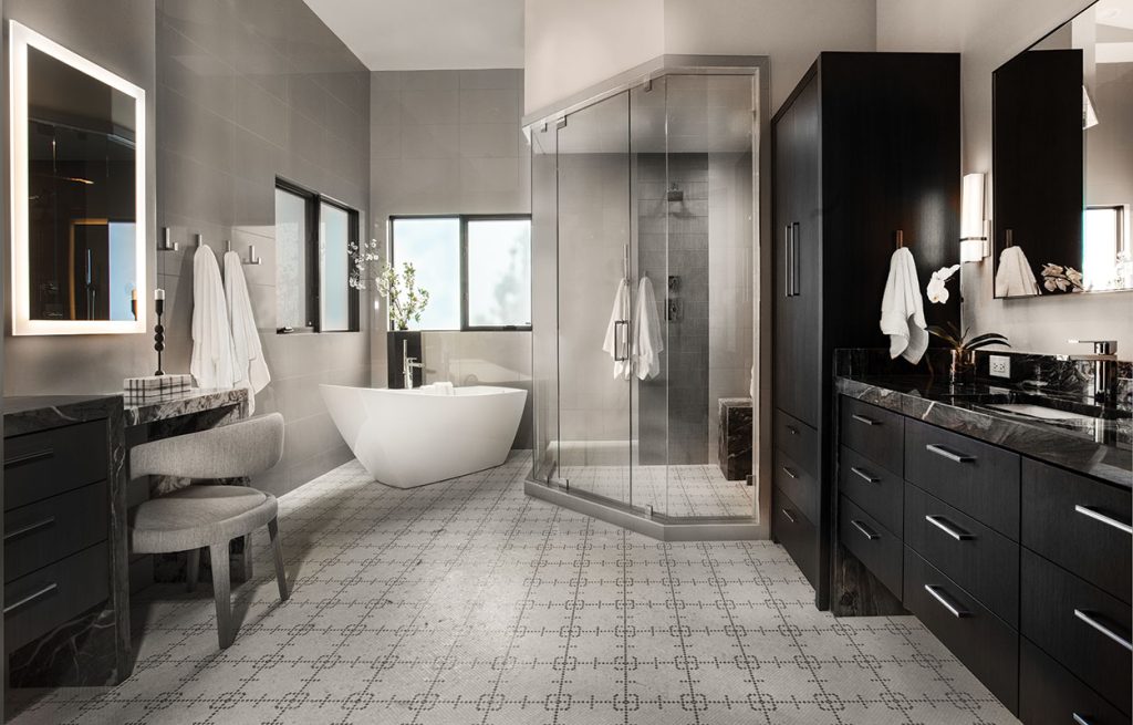 A new glass-walled corner shower opens the primary bath, where a second vanity and storage tower share the same side of the room. Dark cabinetry contrasts with the room’s light, airy palette for a dramatic effect.