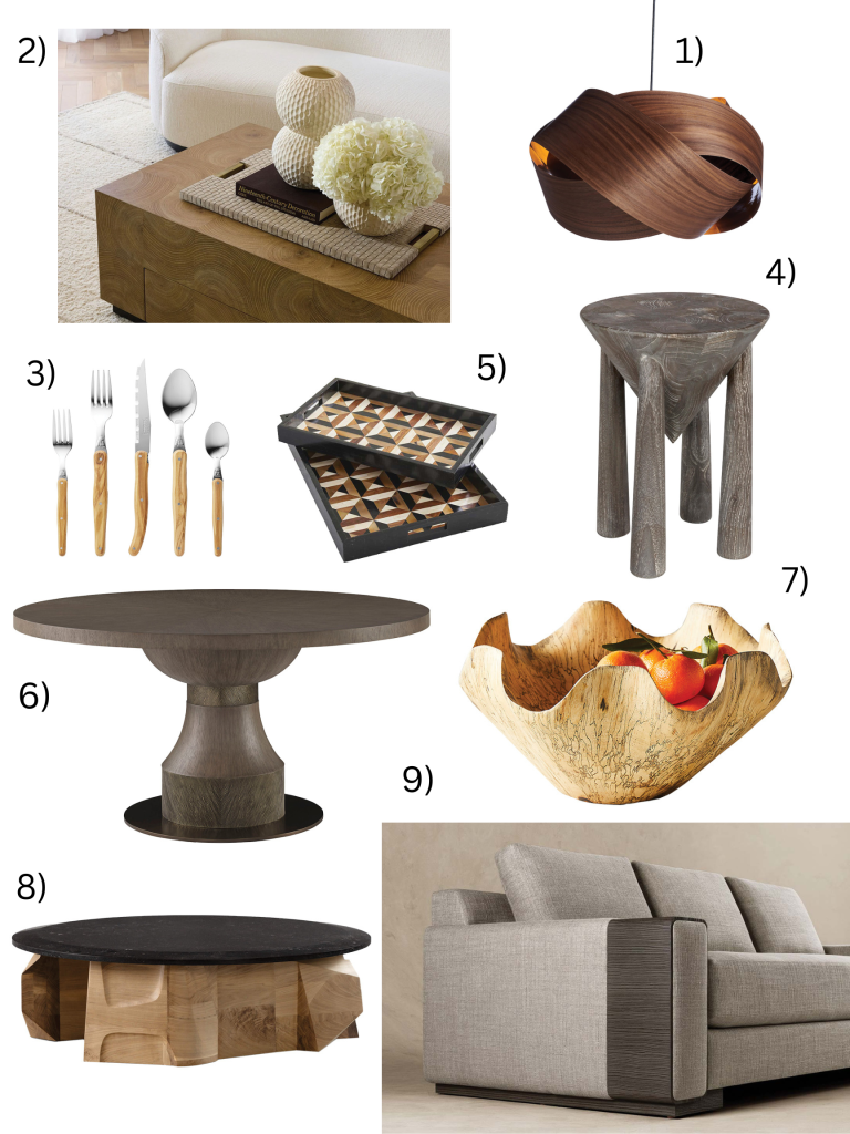 1. Serene pendent in walnut, starting at $1,352, Wood Lighting Design, woodlightingdesign.com 2. Justice Cocktail Table by Arteriors, to the trade, Curate to the Trade, SLC, curatetothetrade.com 3. Jean Dubost Laguiole Olivewood Flatware Set, $400 (20-piece set), Williams Sonoma, SLC, williams-sonoma.com 4. Kongo Side Table by Noir, $665, Four Chairs Furniture, Lindon, 4-chairs.com 5. Triangle Marquetry Tray, $655, Alice Lane Home Collection, Draper, alicelanehome.com 6. Vulcan Dining Table by Susan Ferrier for Baker Furniture, to the trade, Curate to the Trade, SLC, curatetothetrade.com 7. Bloom Tamarind Wood Bowl, $100, CB2, cb2.com 8. Emerine Cocktail Table by Caste, to the trade, Holly Hunt, hollyhunt.com 9. Savon Sofa by Joseph Juep, to the trade, John Brooks Inc., SLC, johnbrooksinc.com