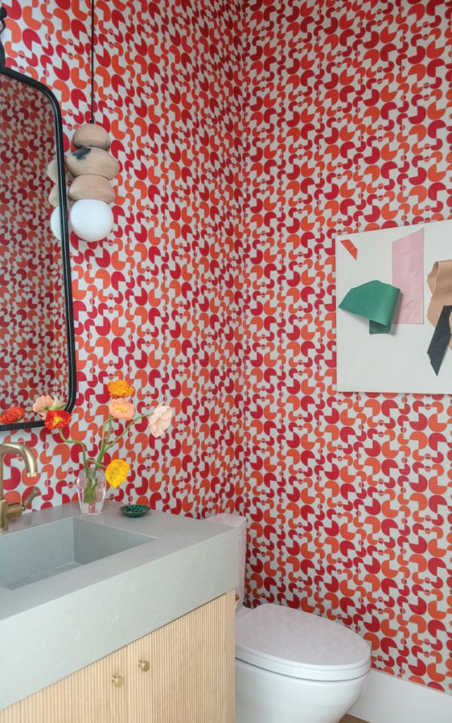 Though the home’s views are breathtaking enough, this family has a robust art collection they were dying to display. And as art lovers themselves, Hunt and Chapelle couldn’t resist opportunities to show pieces off in unexpected ways. In the upper powder room, for example, a brazenly colorful wallcovering matches minimal orange details in an abstract painting. Down a hallway, a blue-drenched artwork pulls the tones from the kitchen further through the living area.